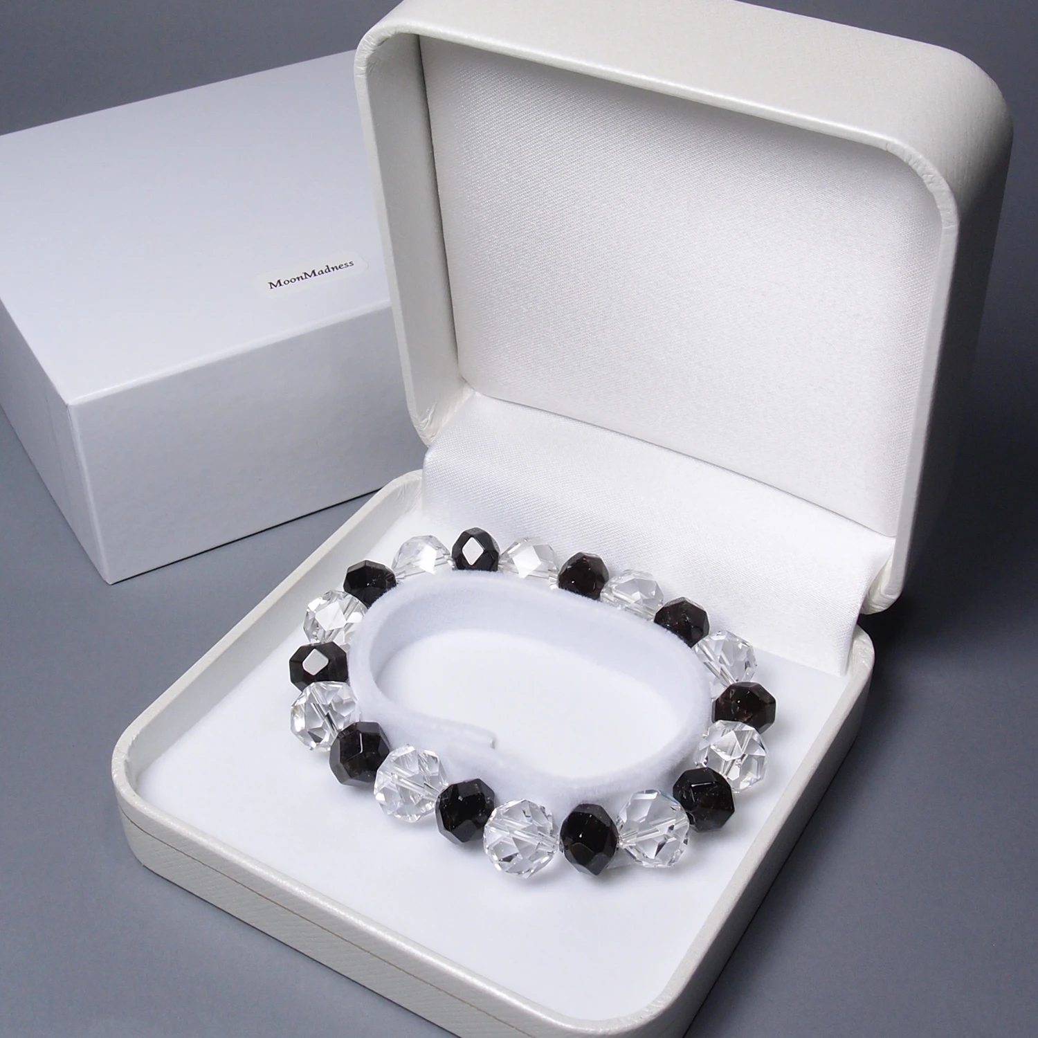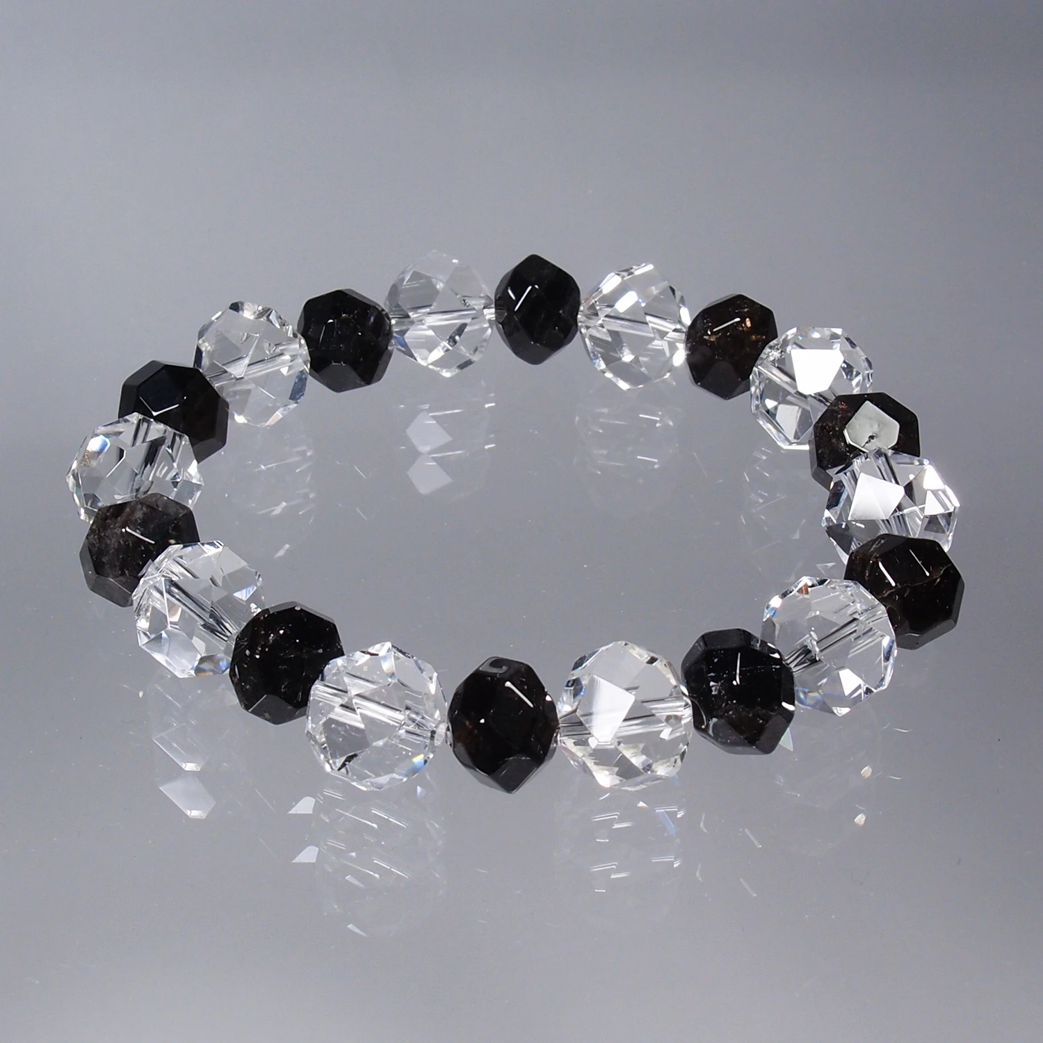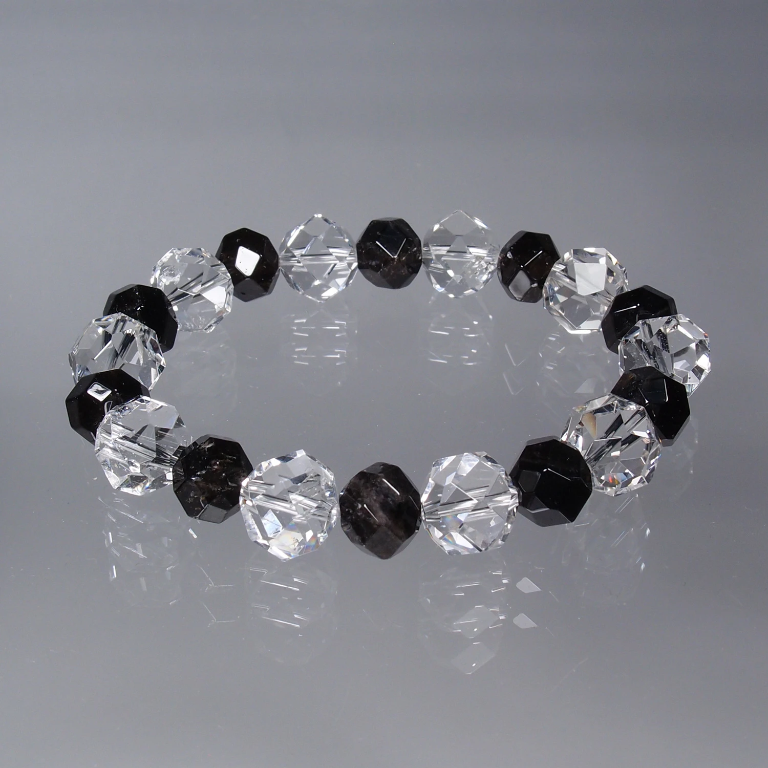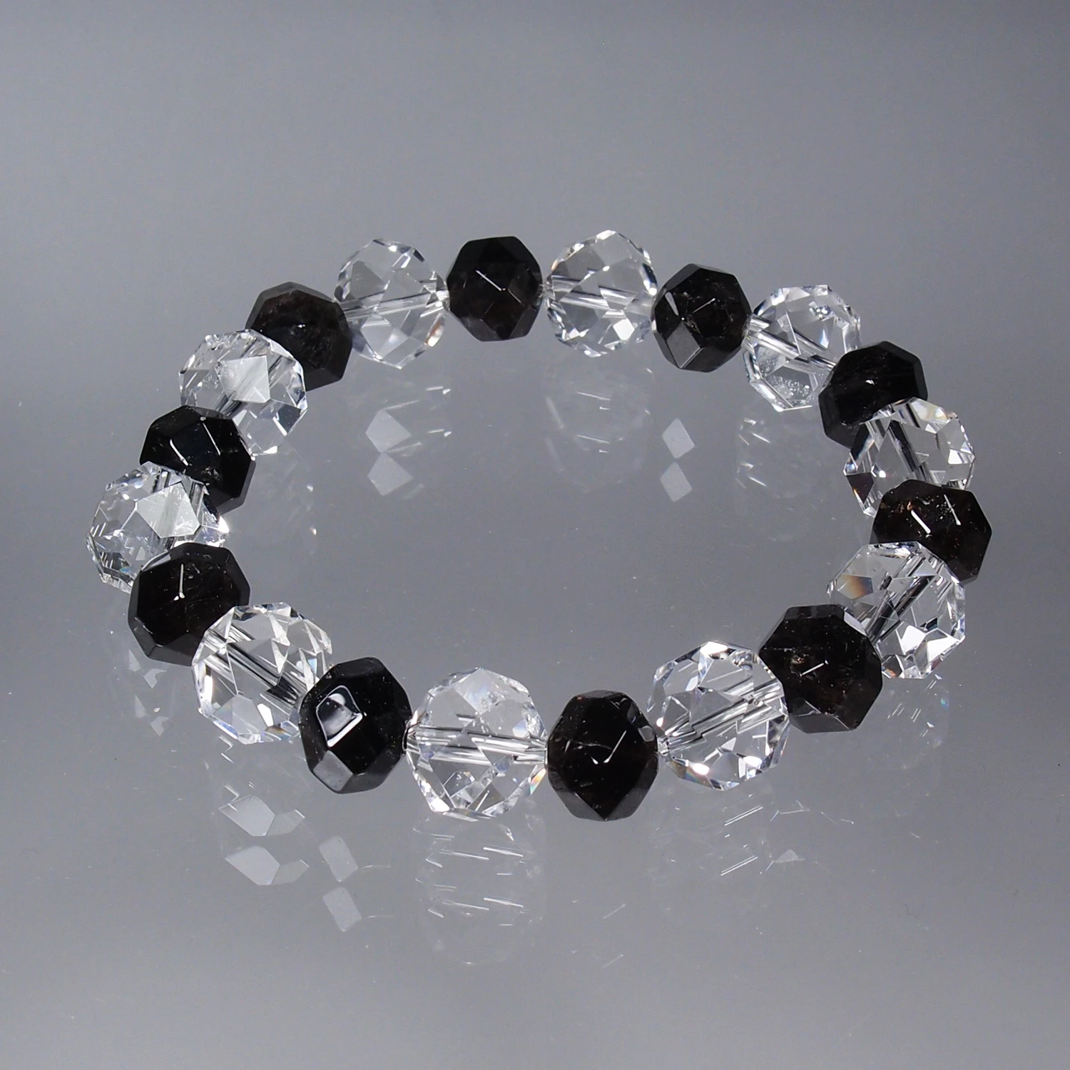 八幡山産水晶連擦り32面10mm玉、黒平産黒水晶連擦り32面8mm玉ブレスレット