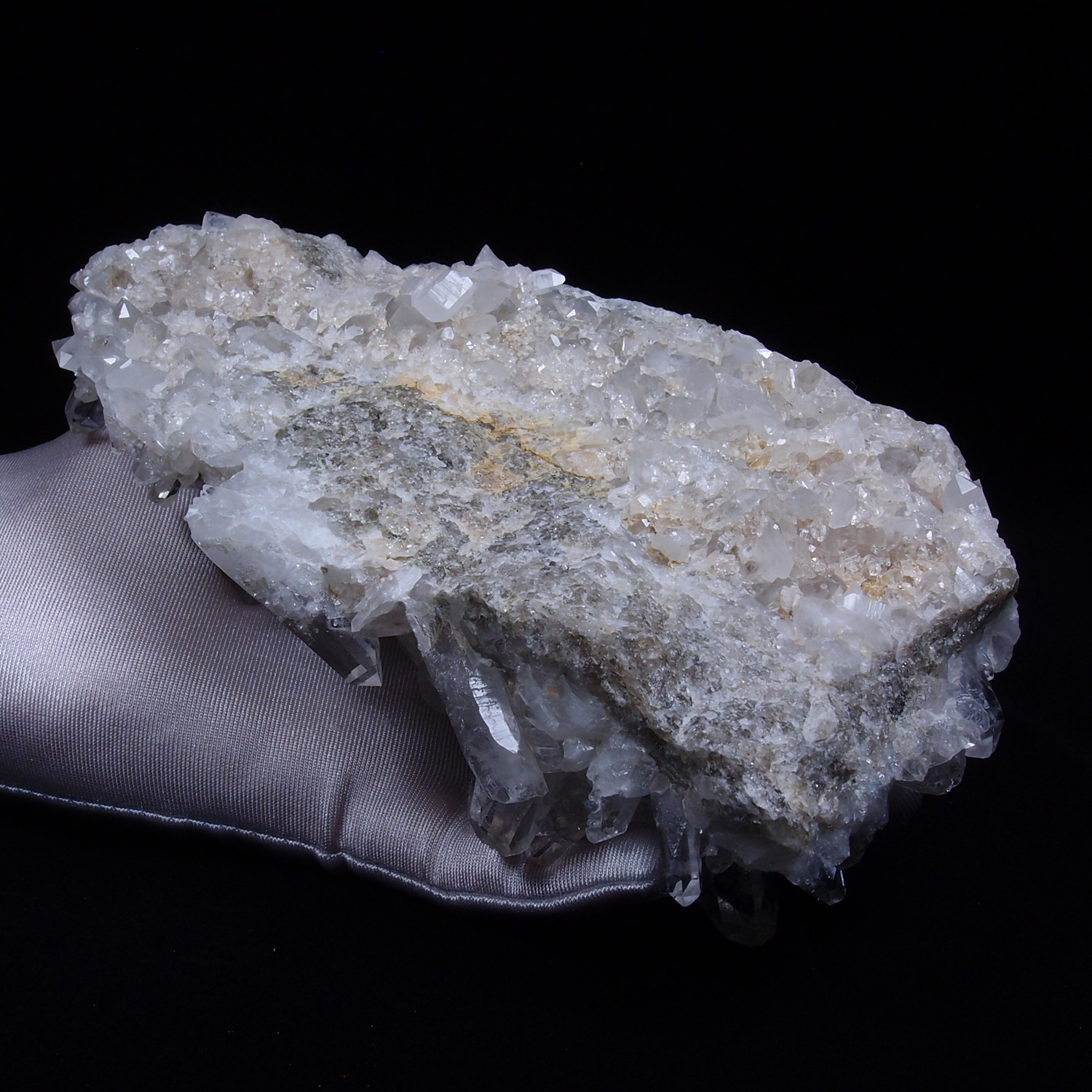この地域では、周囲の共生鉱物が放射能を全く帯びていないため、放射線による着色が起こらず、ほとんどの水晶が純白で高い透明度を持っているのが特徴です。