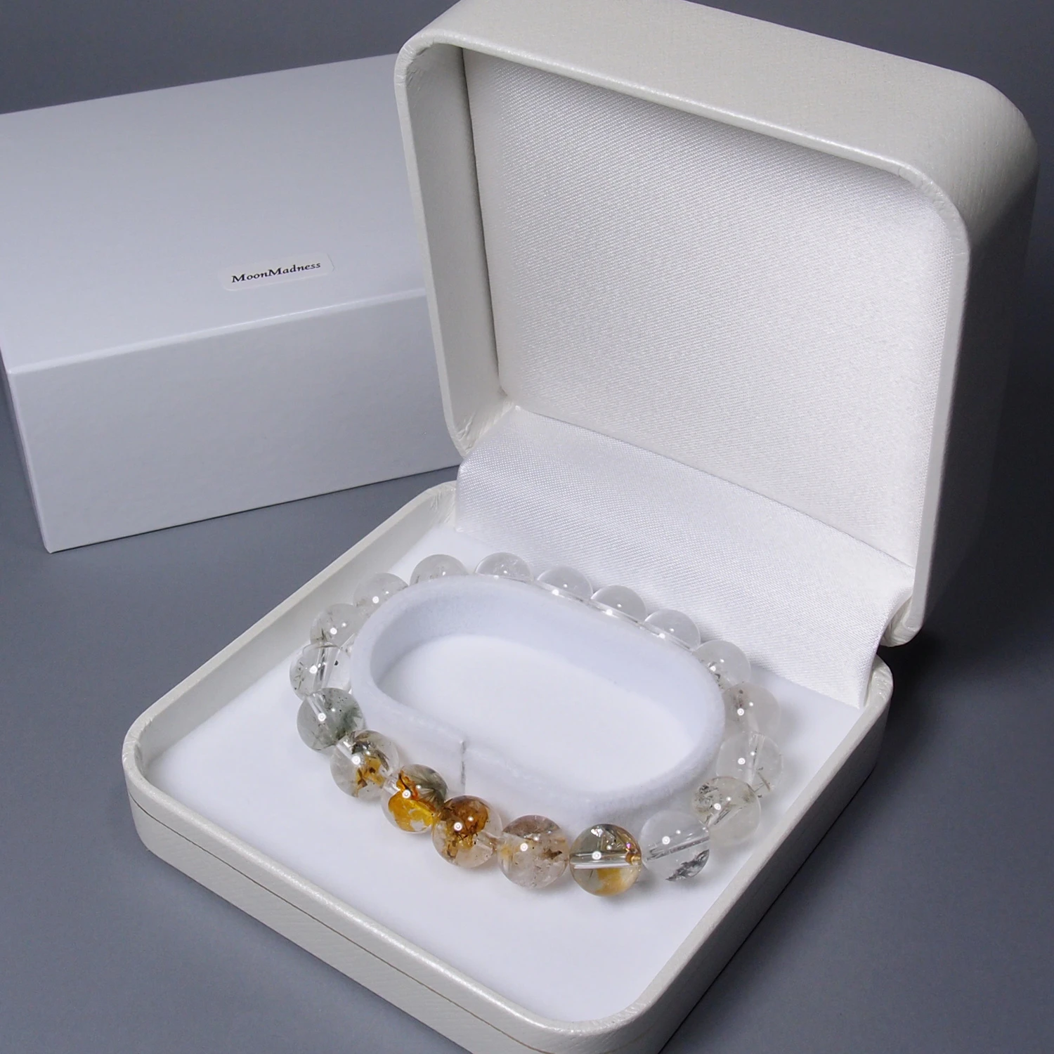 このブレスレットを製作した増富産水晶原石にはクローライトのスジや黄褐色の鉱物、針状鉱物などが内包されていました。透明感のある部分と無い部分のコントラストがくっきりとした面白い原石でした。