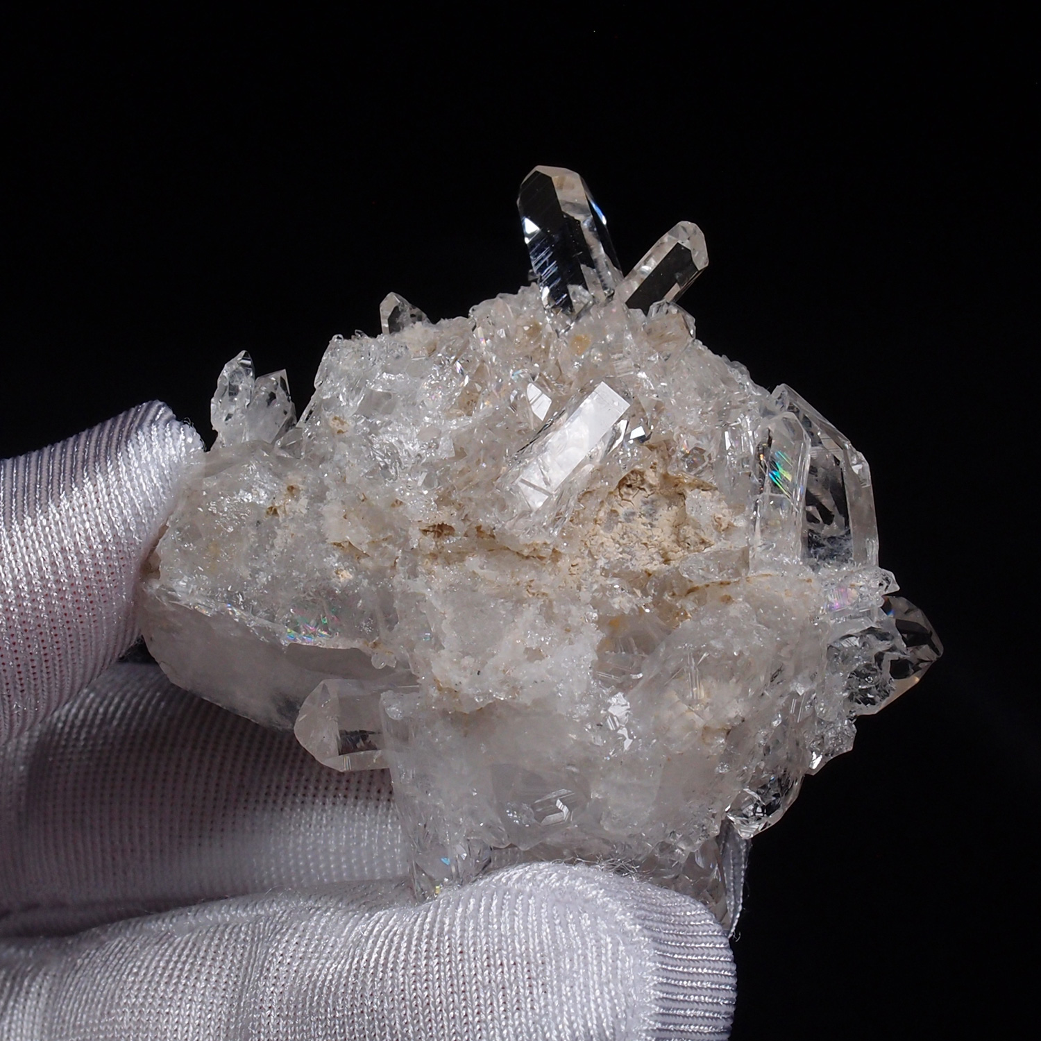 この地域では、周囲の共生鉱物が放射能を全く帯びていないため、放射線による着色が起こらず、ほとんどの水晶が純白で高い透明度を持っているのが特徴です。