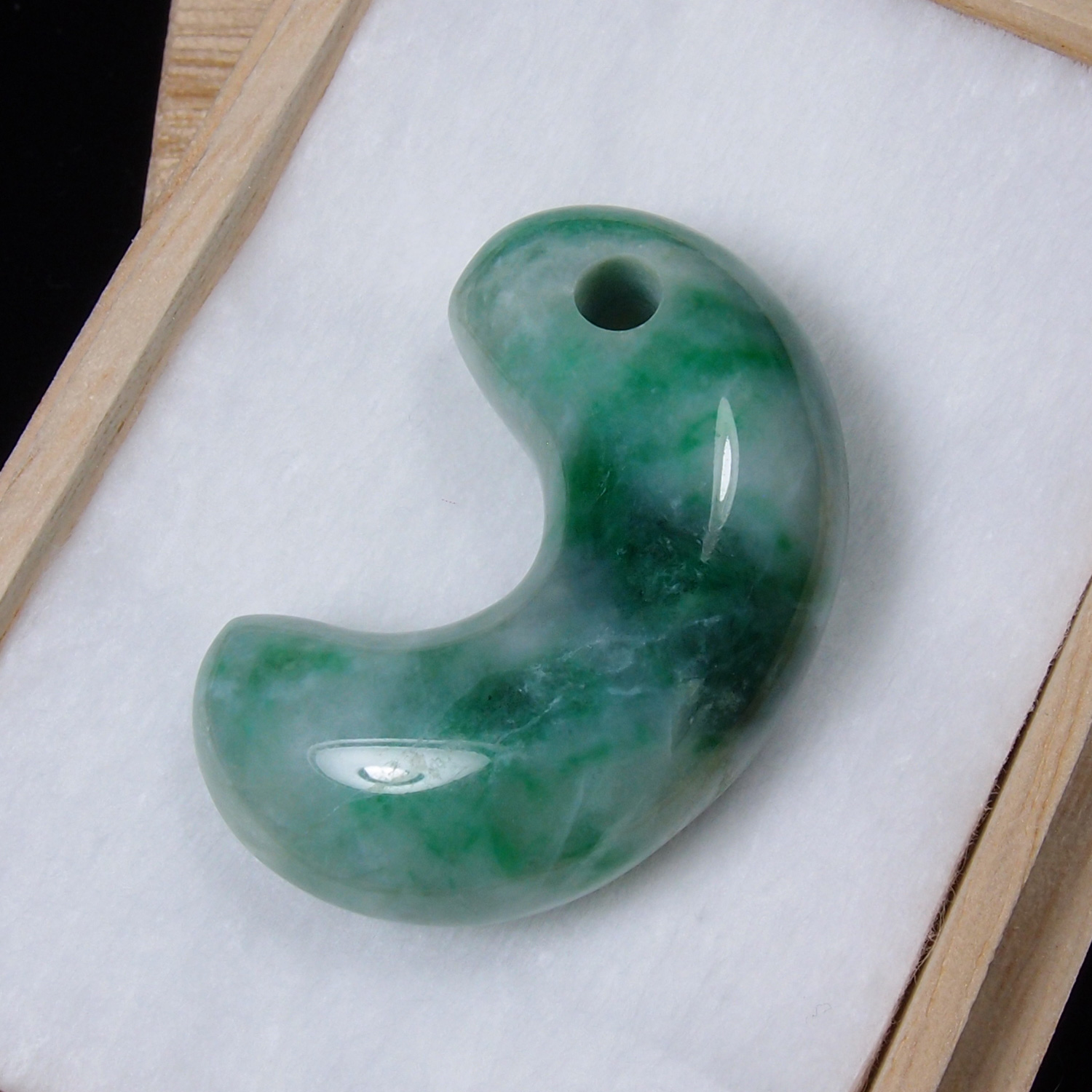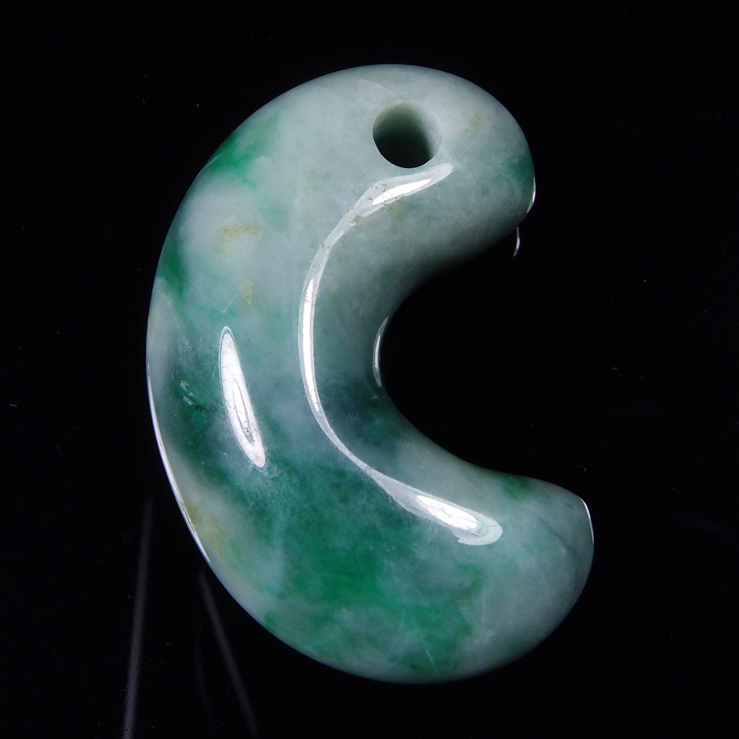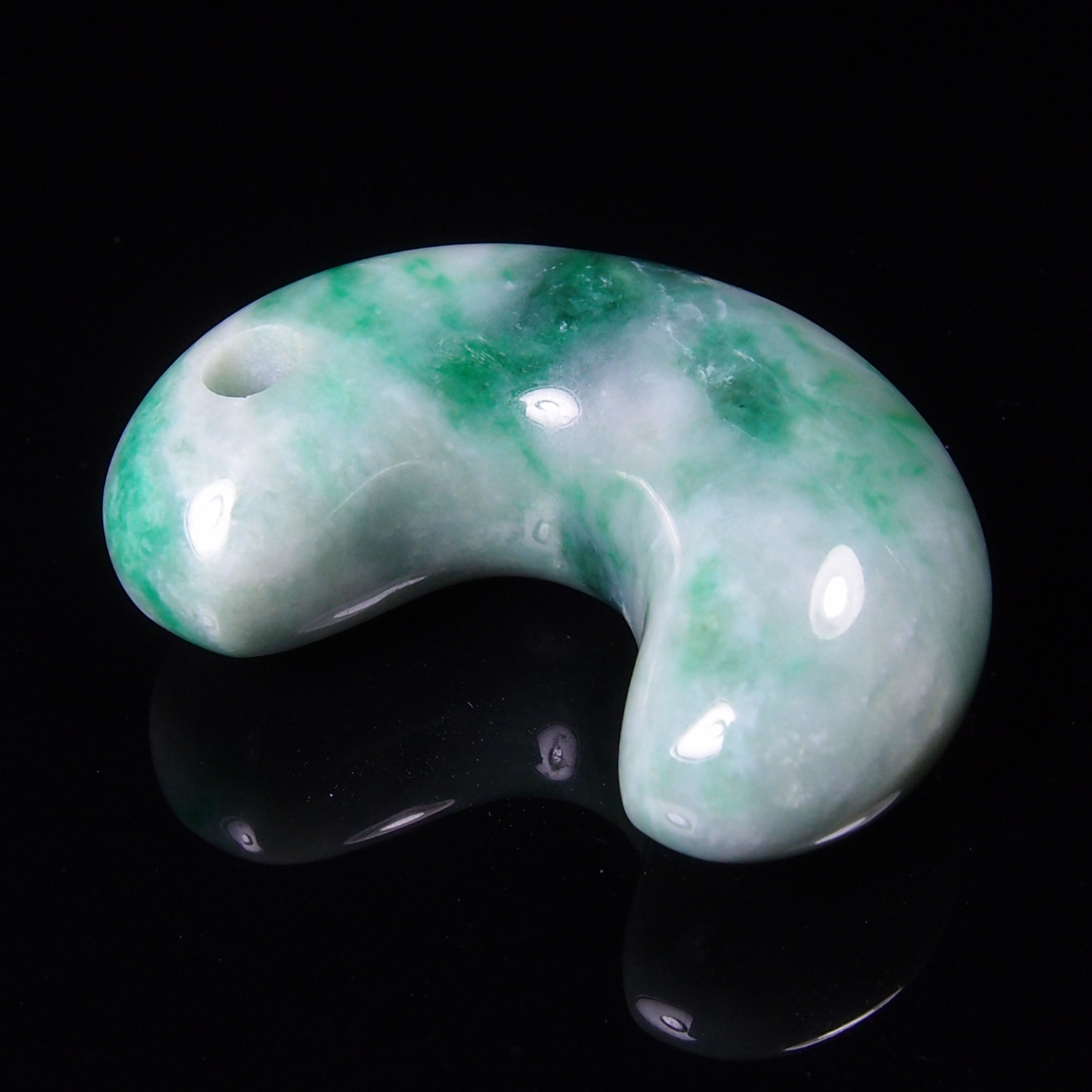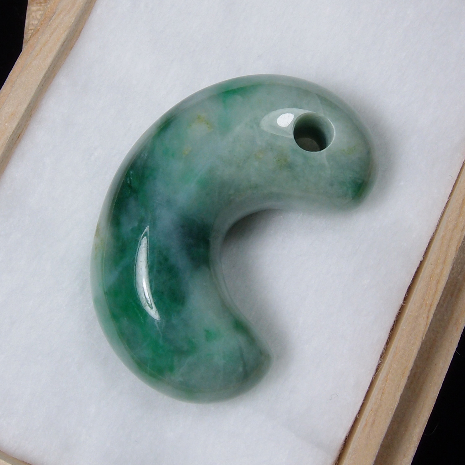 この勾玉は、糸魚川産らしい白と緑の濃淡が美しい高品質な翡翠を、艶やかに磨き上げた逸品です。
