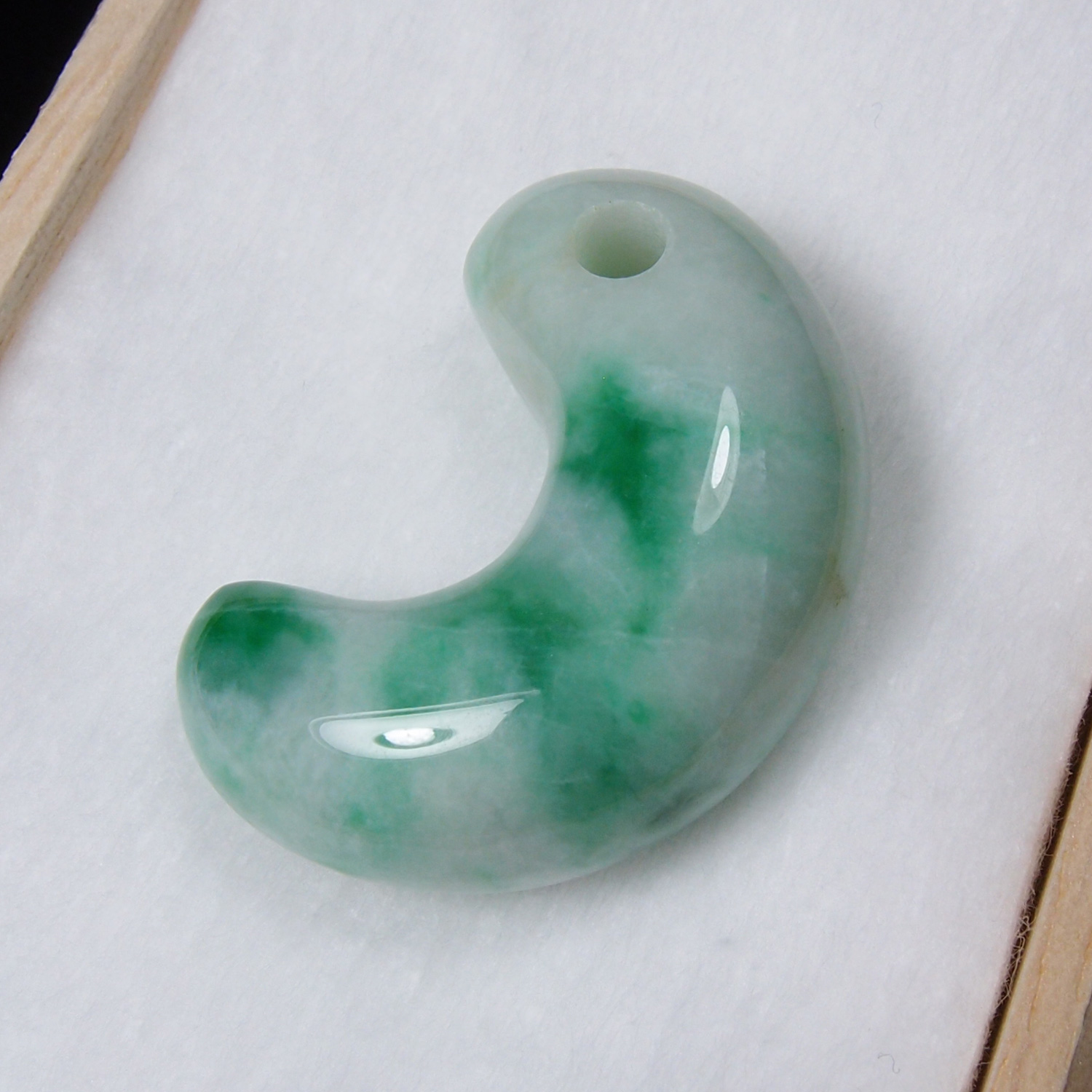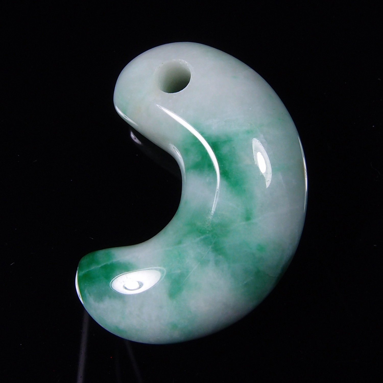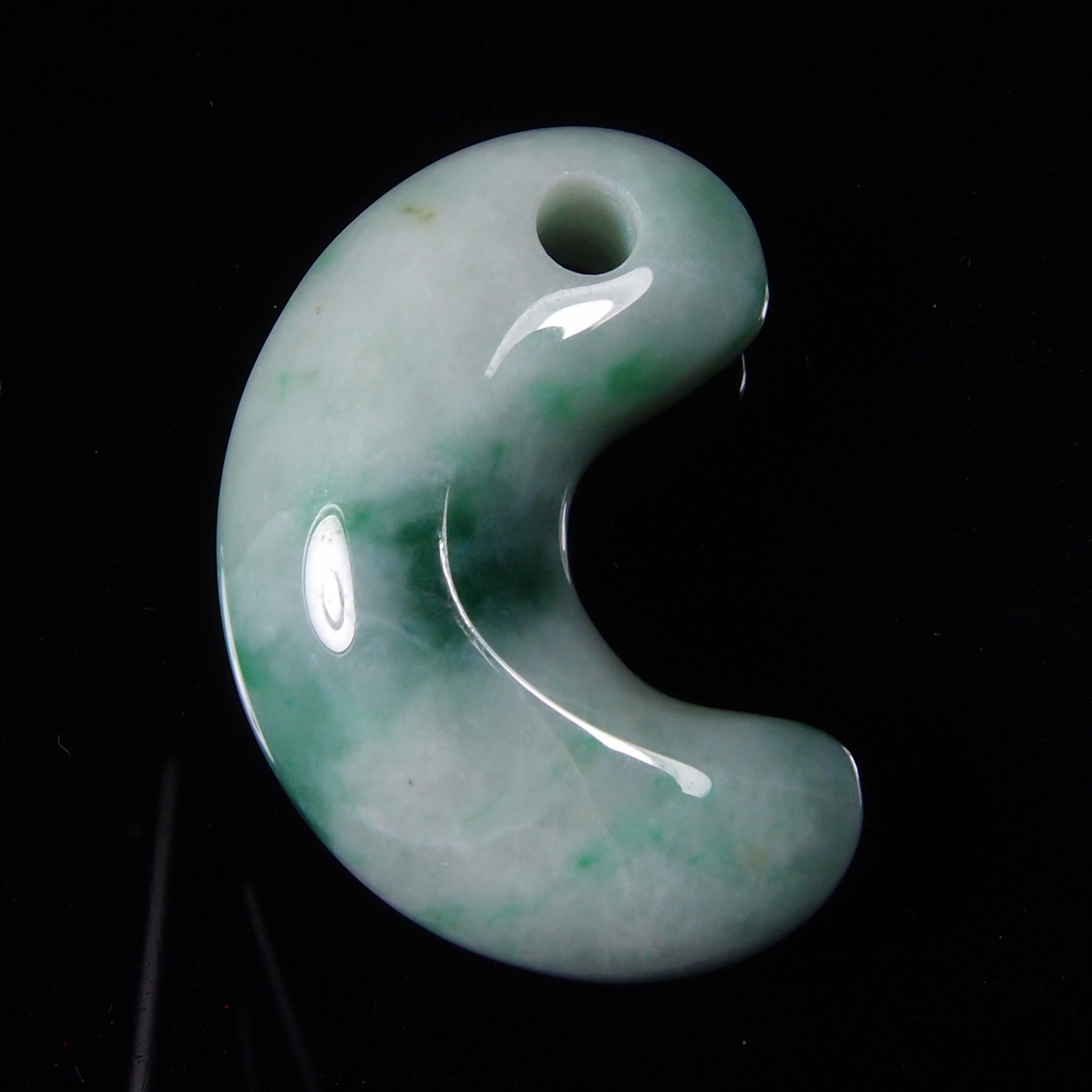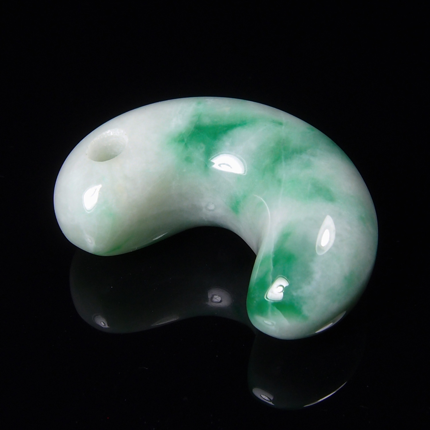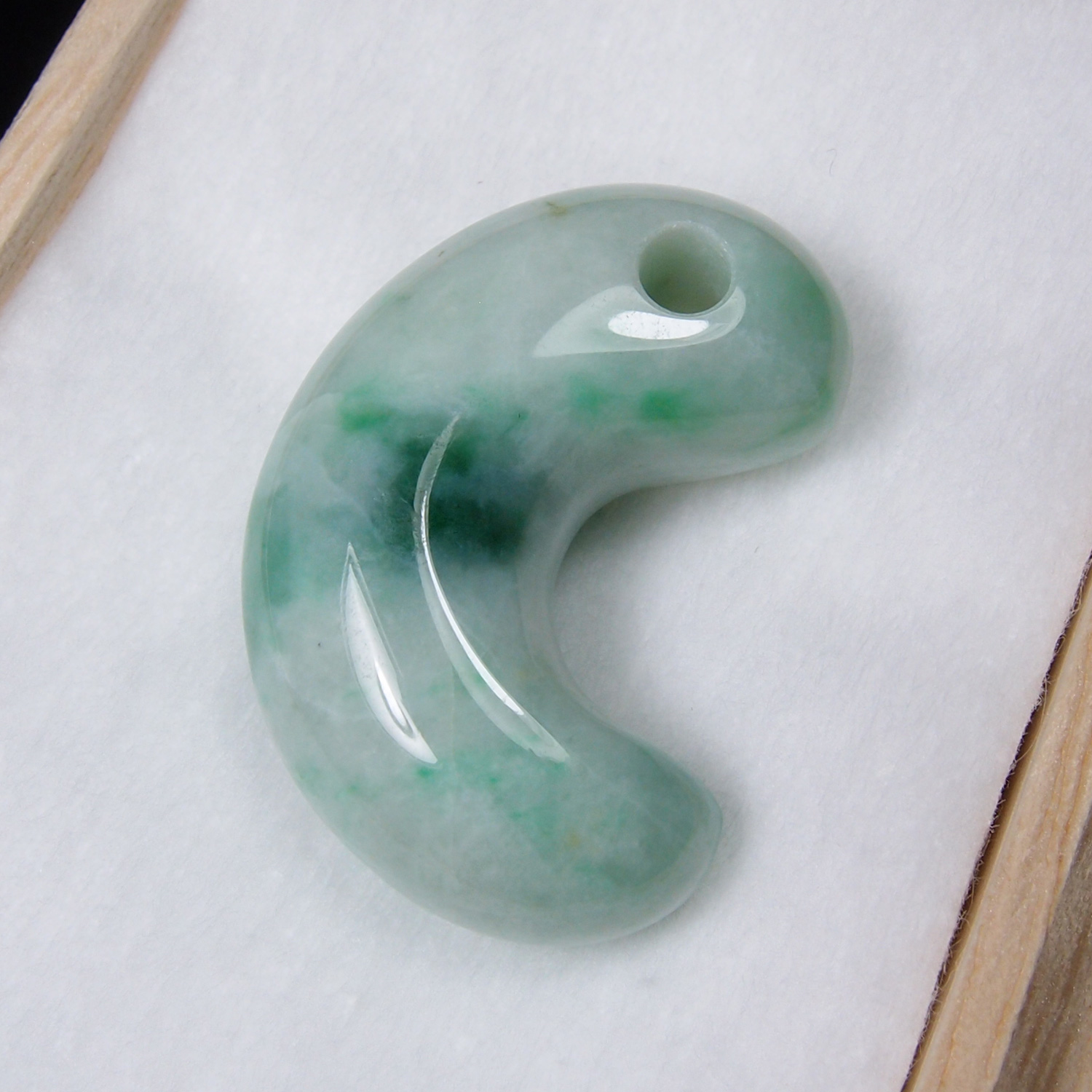 この勾玉は、糸魚川産らしい白と緑の濃淡が美しい高品質な翡翠を、艶やかに磨き上げた逸品です。