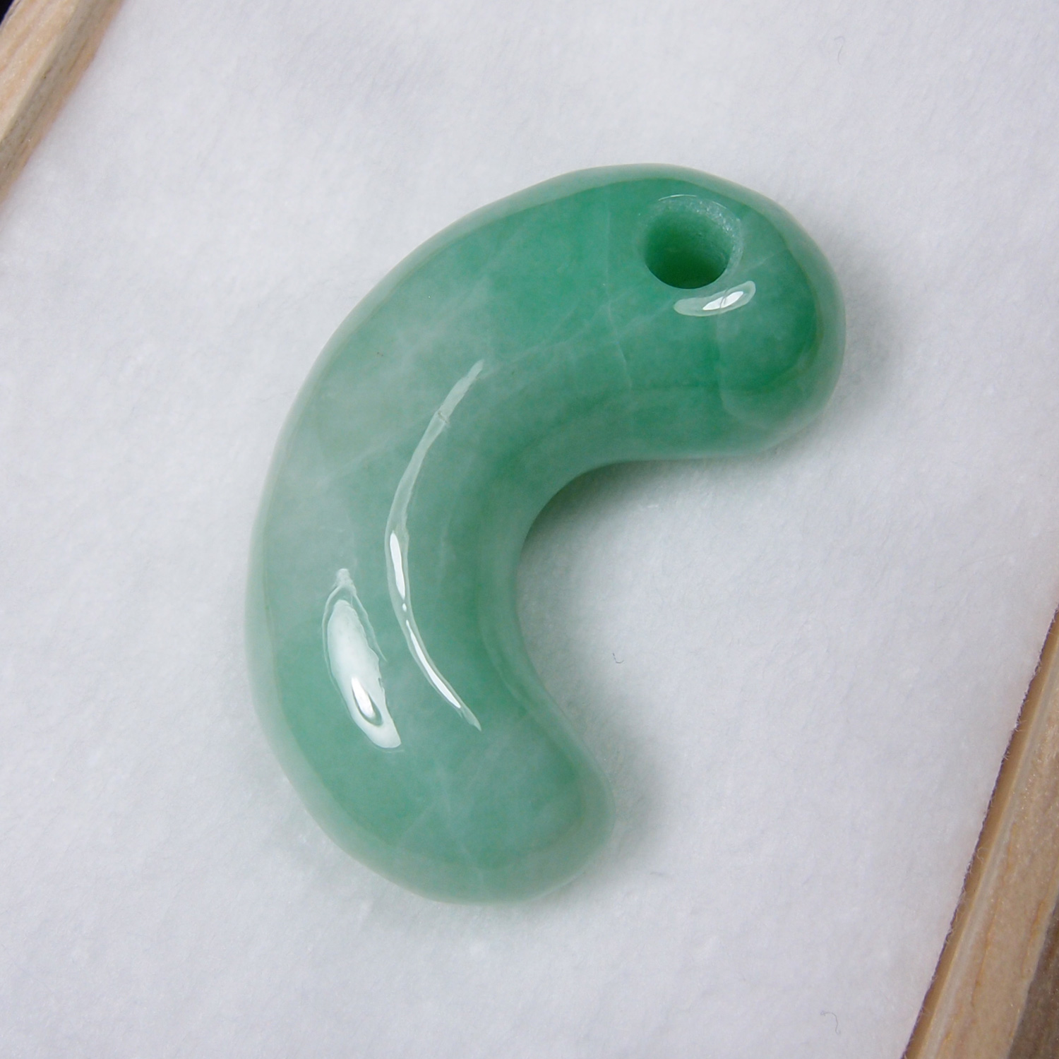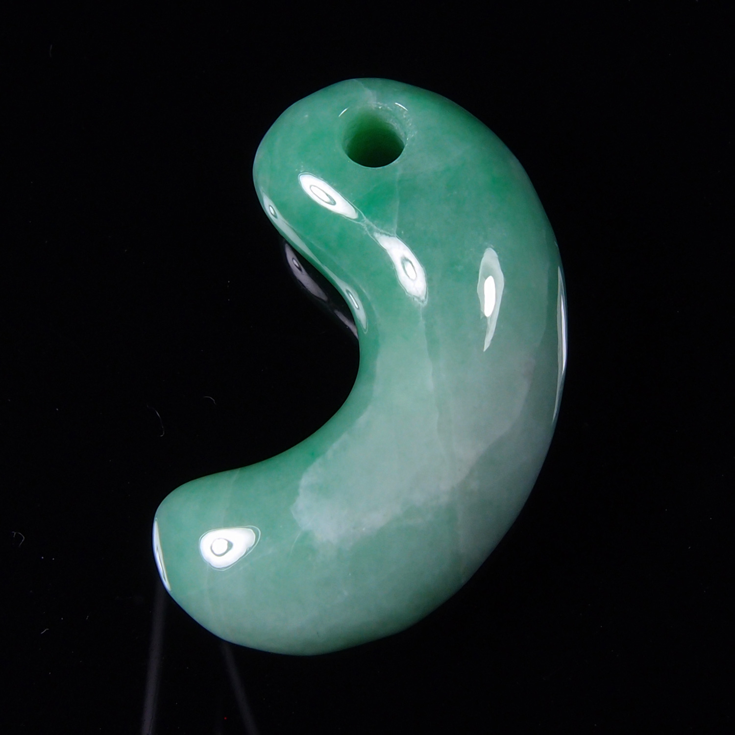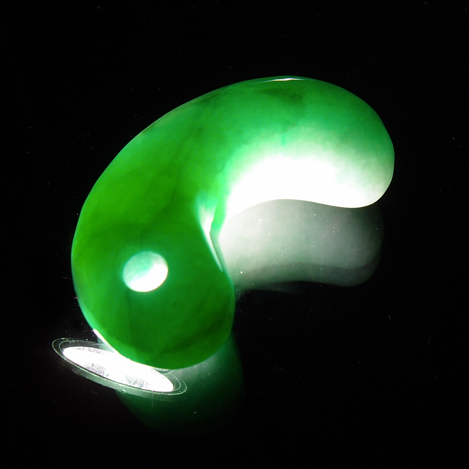 この勾玉は、とても品質の高い、明るく鮮やかな緑色の翡翠を磨き上げた逸品です。