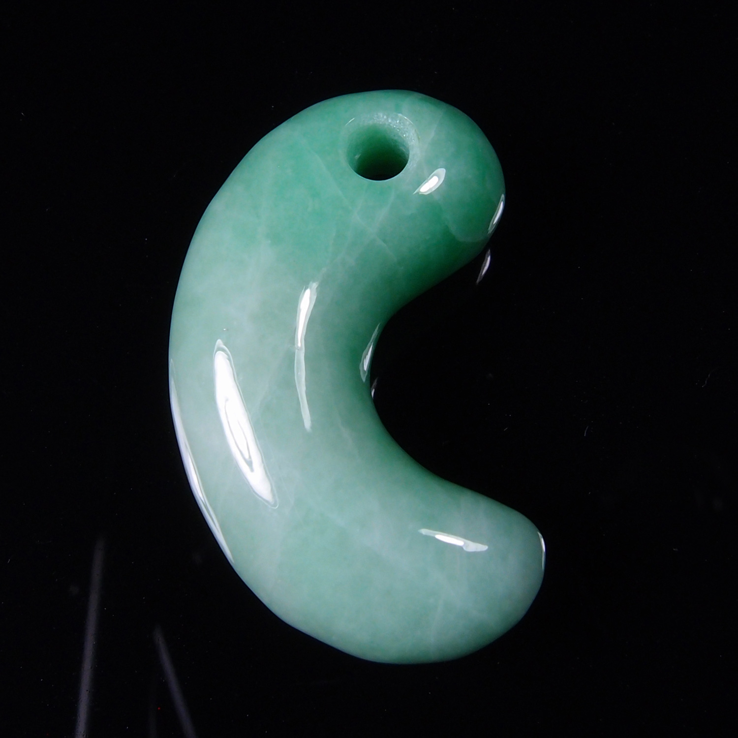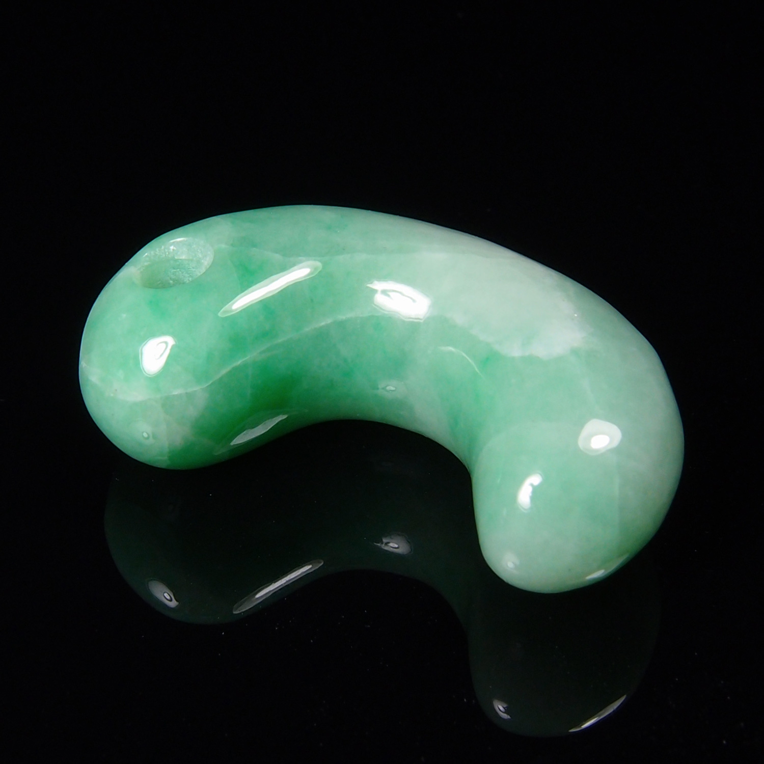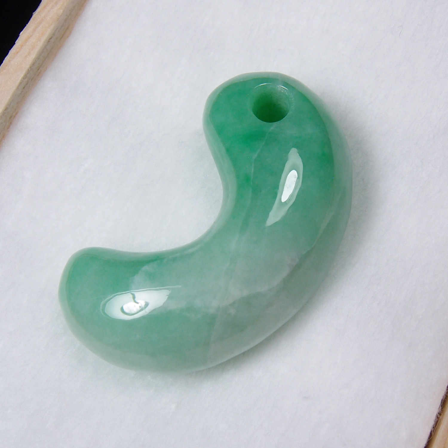 この勾玉は、とても品質の高い、明るく鮮やかな緑色の翡翠を磨き上げた逸品です。