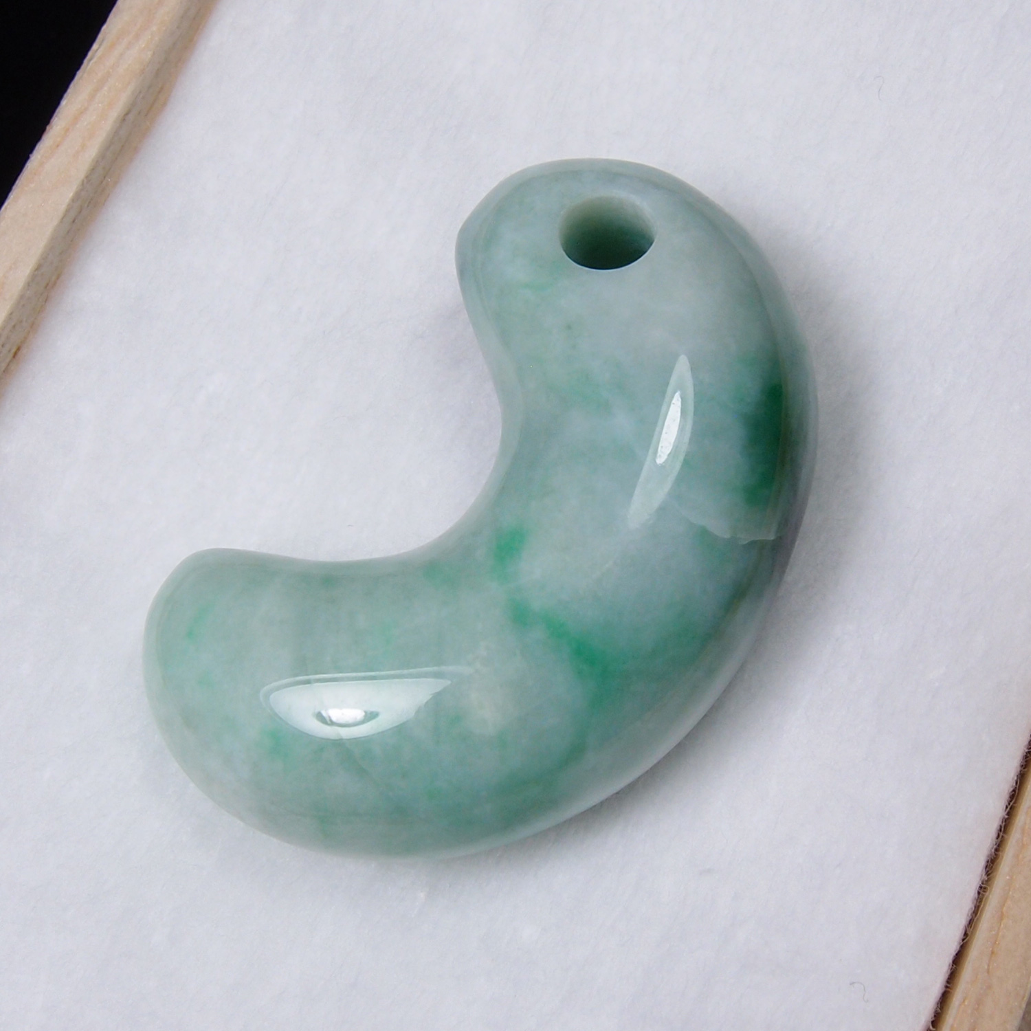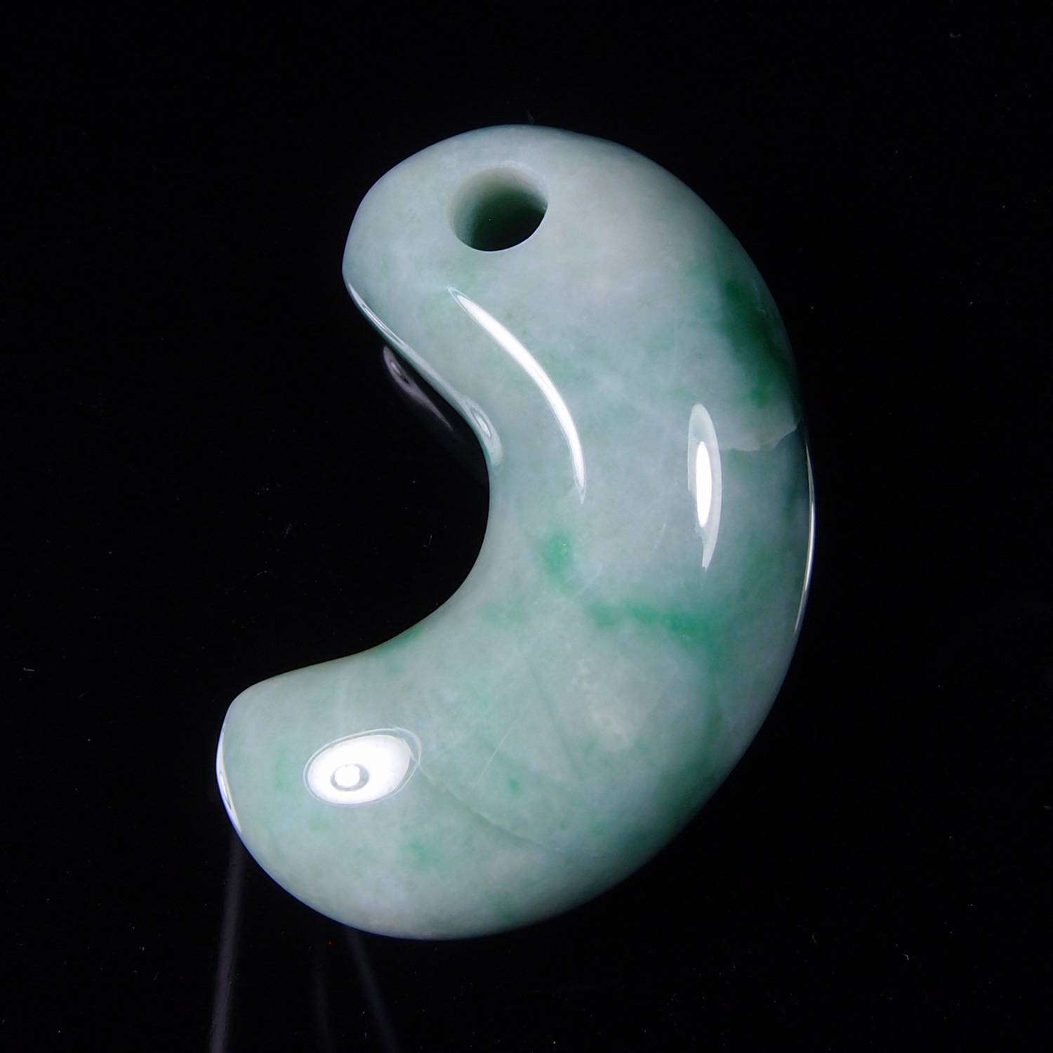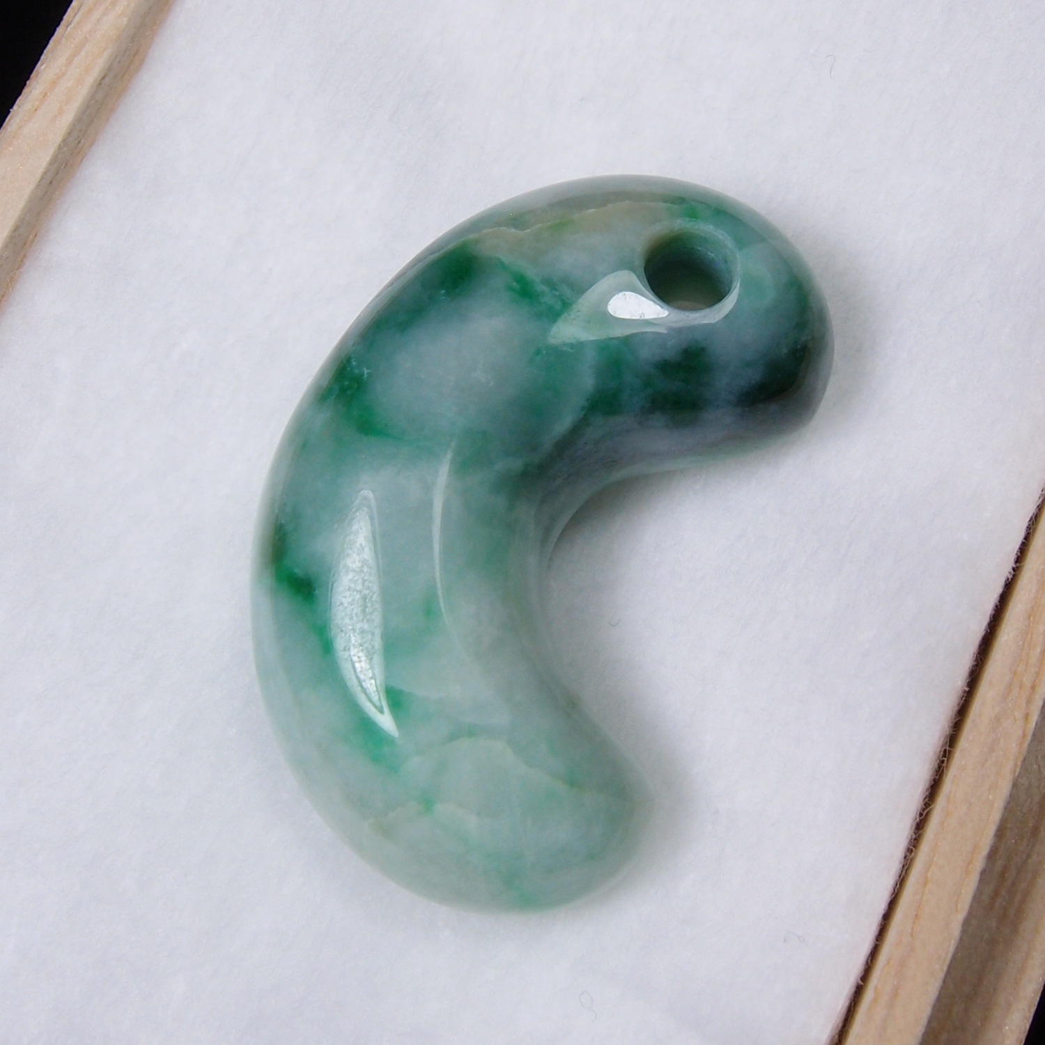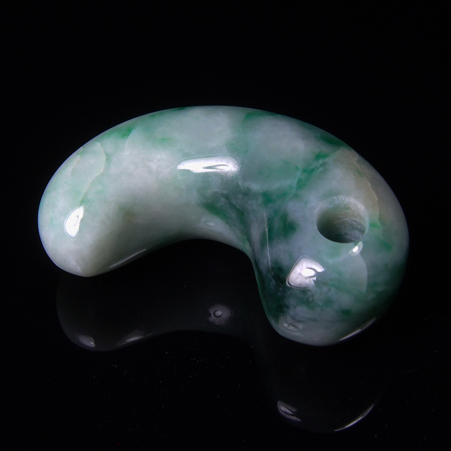この勾玉は、糸魚川産らしい白と緑の濃淡が美しい高品質な翡翠を、艶やかに磨き上げた逸品です。