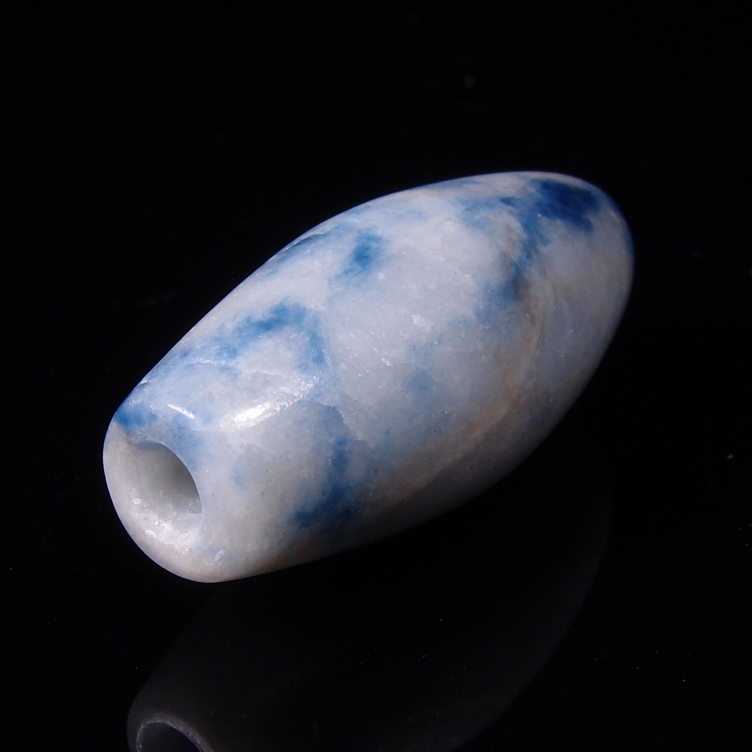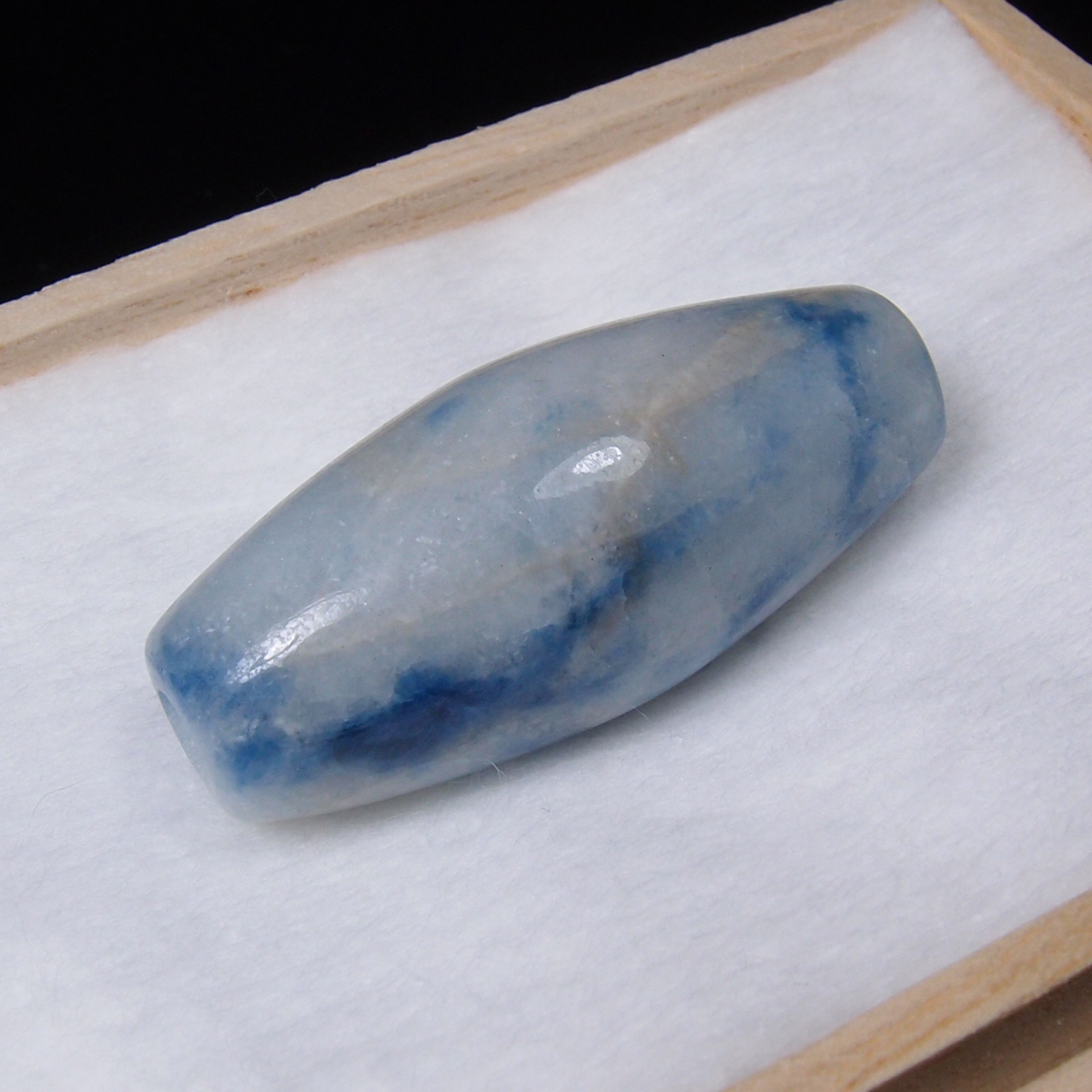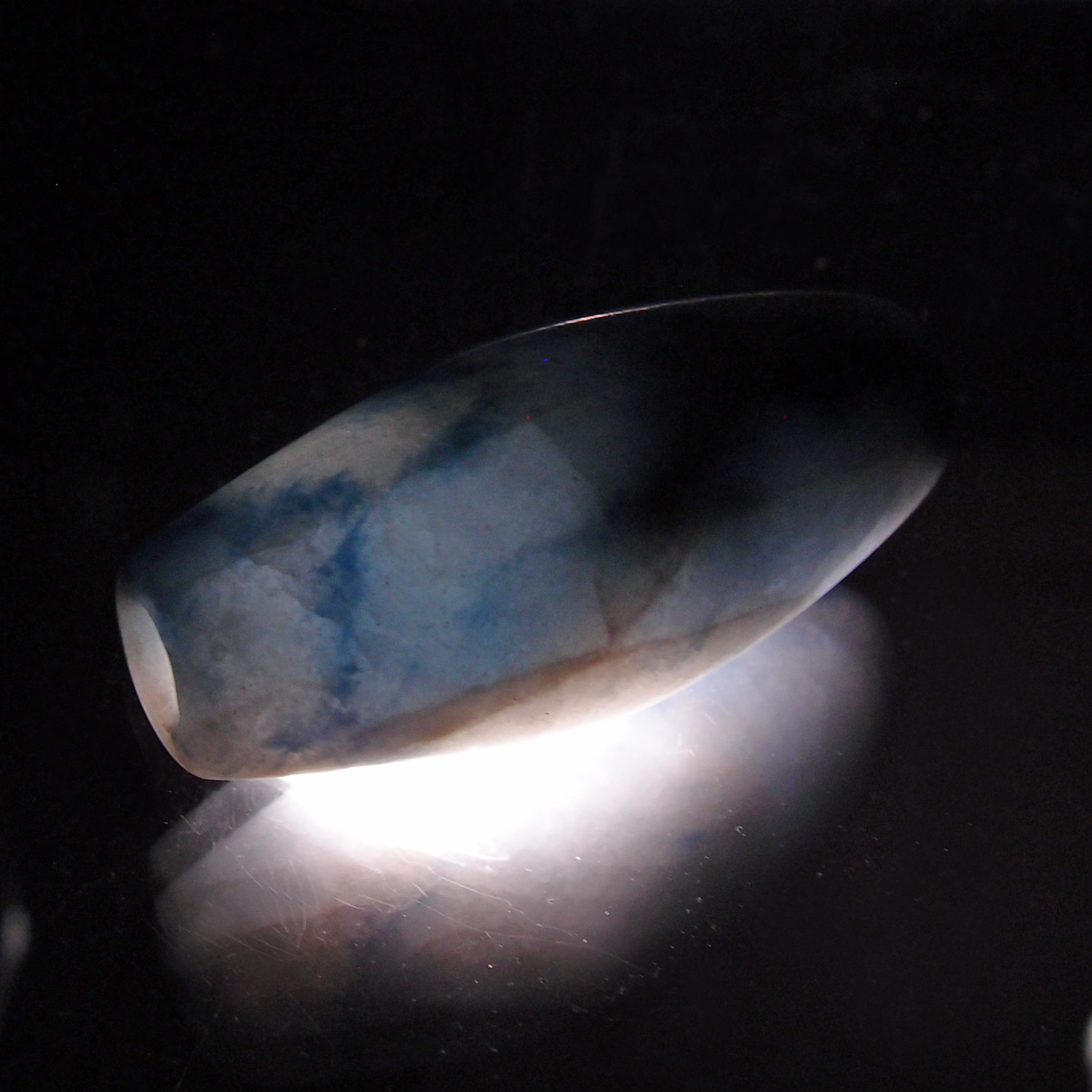 非常に稀少な入コン沢産青翡翠の管玉です。青色の濃淡が美しく、透明度もある、質の高い青翡翠です。