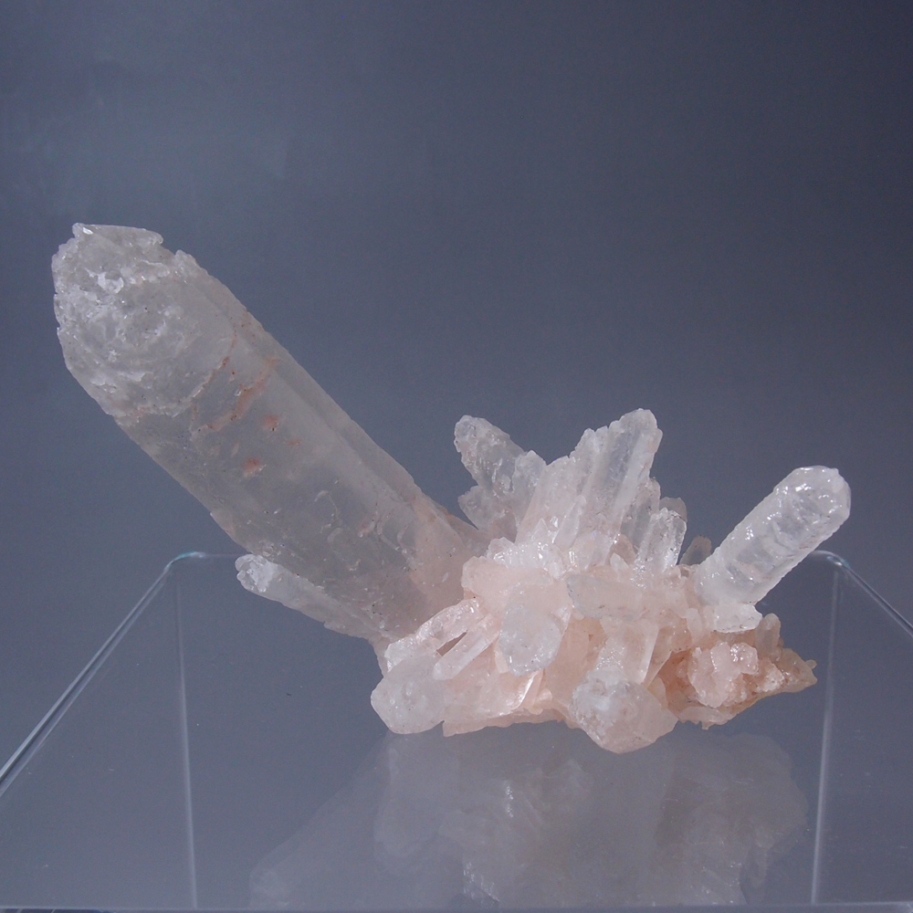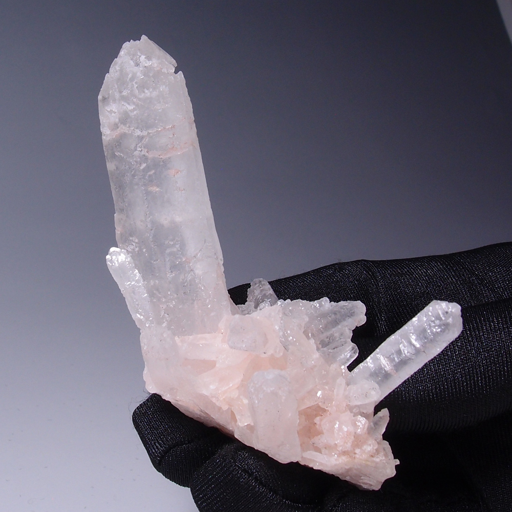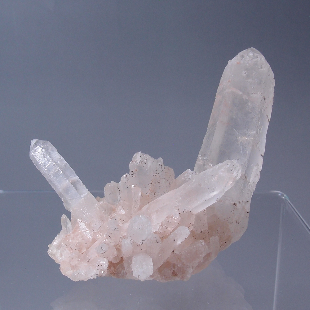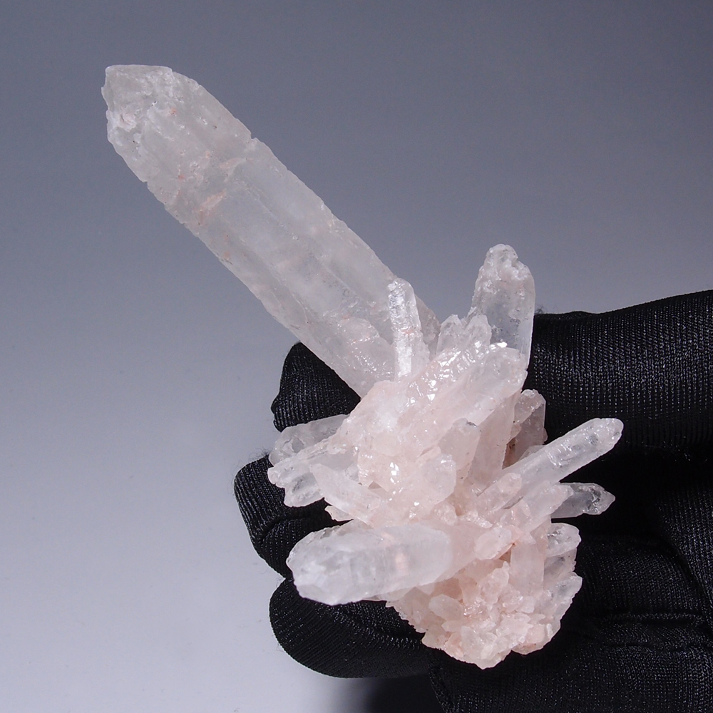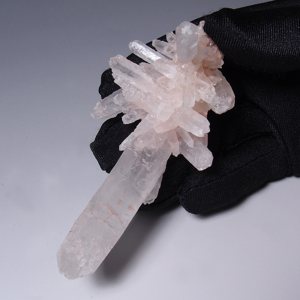 氷砂糖のような優しい雰囲気の水晶や、淡いピンク色を帯びたピンククリスタル、アイスクリスタルと同じように岩盤などの干渉を受けた独特の形、結晶が連なった連晶やカテドラル。中には、アイスクリスタル同様、C面やトライゴーニックを持った水晶も見られます。